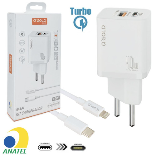 CARREGADOR DE CELULAR A'GOLD IPHONE TURBO 40W 1USB+USB-C